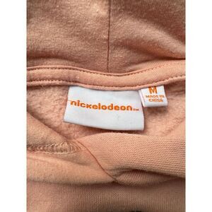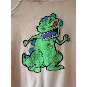 Nickelodeon Rugrats hoodie featuring Reptar the Dinosaur. A peachy pink pullover with a drawstring hood. Reptar is green, blue and purple with red eyes. Chenille dinosaur raised character. Cotton polyester blend. Oversized medium. Unisex sweatshirt. Excellent condition with no flaws found.