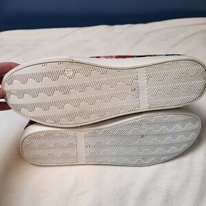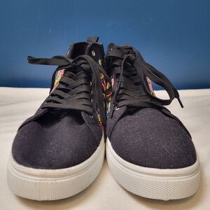 Vibrant high-top sneakers with a playful design. Features a mix of colors on a black base. Size 11.