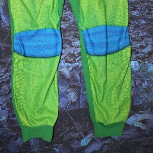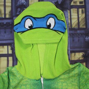 This product is a Nickelodeon Teenage Mutant Ninja Turtle one piece pajama featuring Leonardo's character design. Made of polyester fleece material, the one-piece outfit has a zip closure, long sleeves, and a hood for added comfort. The green color and cartoon-themed design make it perfect for fans of the Teenage Mutant Ninja Turtles, with a vintage feel of the character family. Easy to care for with machine washable fabric, this lightweight garment is ideal for winter, fall, and spring seasons, providing a fun and cozy sleepwear option for kids.