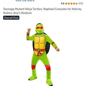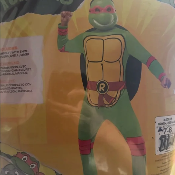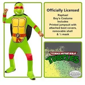 Official Rubie's ninja turtle costume. Green jumpsuit with yellow chest plating. Red mask, belt, and accents. Includes shell and mask. Great for Halloween or playtime.