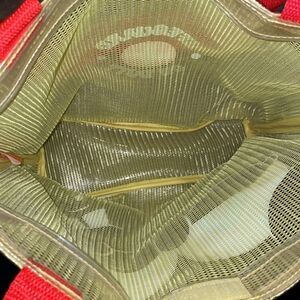 Dead stock, almost vintage, 2005, Y2K, Spongebob Squarepants, Yellow vinyl beach back lined with yellow mesh, Velcro closure and red handles by Nickelodeon. Graphics printed on both sides. Approximately 11X12" in size. In excellent condition with original tag still attached but selling as pre-owned.