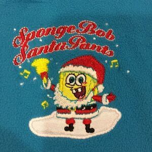 Get ready for Christmas with this SpongeBob Santa pants fleece pullover. Lightweight and easy to wear. The color on this is more of a teal blue. V-neck accentuated with yellow stitching.