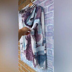 Main colors are purple blue gray shades , prints are also inside hood size 2 x doesn’t stretch measurements are posted for reference.