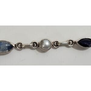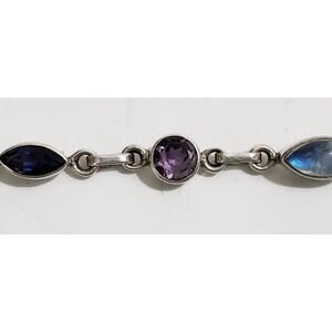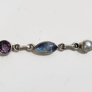 This is a vintage Nicky Butler sterling silver necklace featuring bezel set cabochons of amethyst, moonstone and pearl. Finished with a lobster claw clasp.