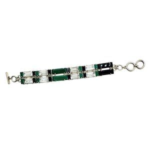 Capture the sophisticated glamour of the Art Deco era with this Nicky Butler Deco inspired bracelet. Rich Green Chalcedony, Clear Rock Quartz Crystal and Black Onyx gemstones, appointed in elegant prong settings, mirror each other in the intricately detailed bezels. Hand crafted in .925 Sterling Silver and appointed with a polished sterling silver toggle.