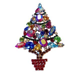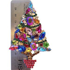 Fabulous vintage holiday brooch by jewelry designer Nicky Butler. This extra large Christmas tree brooch pin shimmers with a colorful display of crystals and rhinestones to add a festive touch to your holiday wardrobe. Enjoy the compliments as this rare find brings an abundance of good cheer to your holiday season!