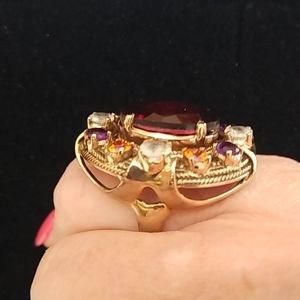 New faceted ruby colored oval stone surrounded by purple, tangerine. Bronze setting marked NB and India. 1.25 inch.