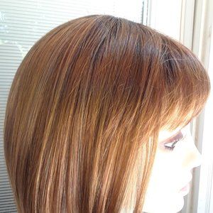 Nico from our Rene of Paris Hi-Fashion Collection is a short-length synthetic wig. This straight ready-to-wear is a short chin-length bob with full fringe. It’s a sleek and effortless style for all face shapes. Nico is machine made with adjustable tabs in the back nape area to allow a more comfortable fit. The result is a comfortable fit with a natural look that is both fashionable and easy to wear. #Rene of Paris #honey Brown #Nico #Synthetic wig #wigsforsale