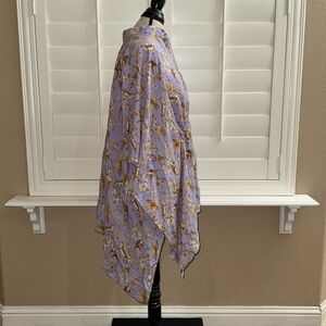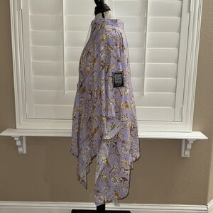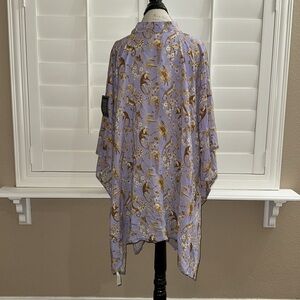 A fun and whimsical twist on classic toile de jouy, the Julia Kaftan in Whimsical Jungle Toile in Saffron on Lavender features a medley of monkeys and leopards nestled in a fantasy jungle. This short kaftan poncho may be worn over pants, as a dress or as a cozy cover-up.