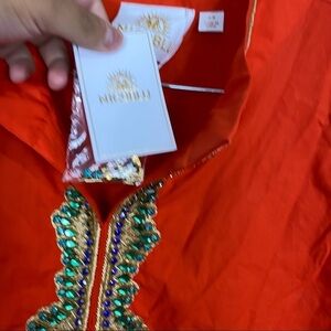 A resplendent hand embroidered motif of emeralds and sapphires interwoven with gold bullion thread forms the centerpiece of a sleek, modern tunic shape. The color is scarlet–a rich, saturated orange reminiscent of saffron and coral.