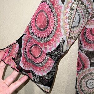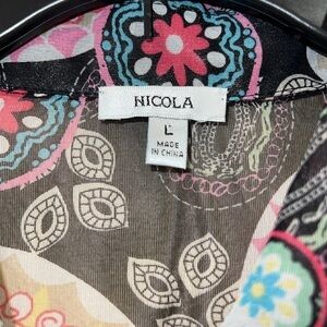 This is a Nicola Vintage Sheer Button Up Blouse size Large contemporary abstract Boho in gently used condition