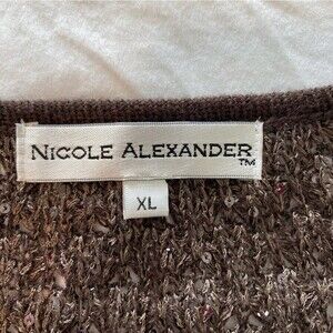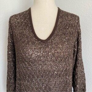 Nicole Alexander Sequin V Neck Lightweight Basket Weave Knit Sweater Brown SZ XL