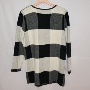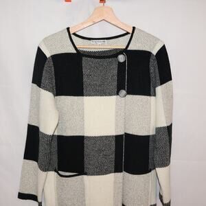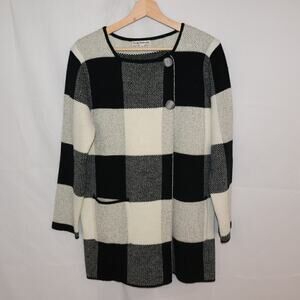 Nicole Alexander Sz M Sweater Jacket Black White Check Three Snap Closure Buttons. Nice jacket - Sweater Coat Tunic length Two front pockets, three snap closures, and a front panel unsnaps to access under layer that also unsnaps to get the sweater on. (See pictures.) It is very well made and will match most colors. A must for your Autumn/Winter closet.