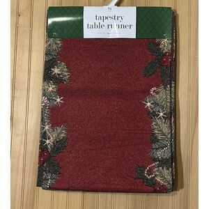 Add a festive touch to your dining table with this Nicole Christmas Tapestry Table Runner. The rectangular table runner features a beautiful floral pattern with pinecone and pine needle accents, perfect for the holiday season. Made in India, this table runner is crafted from high-quality tapestry material and is machine washable for easy maintenance. Measuring 13" x 72", it is suitable for tables with a length of 71-90 inches and a width of 10-15 inches. Whether you're hosting a Christmas dinner party or simply enjoying a festive meal with your family, this table runner is a must-have addition to your table setting.
