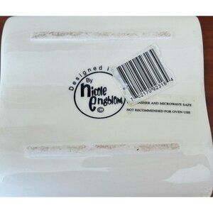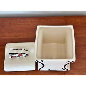 This is an adorable little 8" tall hand painted ceramic dog treat jar from Nicole Engblom. On the lid is a colorful little dog holding a bone in its mouth. Excellent pre-owned condition with no chips or cracks.