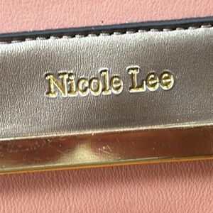 Nicole Lee dusty pink wallet with metallic silver insert on flap and gold hardware. Included removable strap is tan. Great condition, the metal strip at closure still has the protective vinyl. Snap closure is magnetic, and interior is fuchsia .