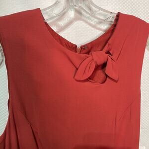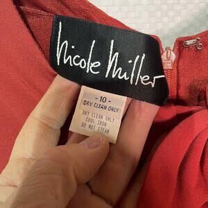 Nicole Miller vintage sleeveless dress size 10 fully lined viscose nylon spandex blend in a great salmon shade with a neckline knotted detail. Back of dress full zipper entry , from fitting, four way dress stretch , new old stock , NWT, spring summer winter fall contemporary retro style park beach wedding dress rehearsal dinner date night cocktail party dressy clean lines farmhouse