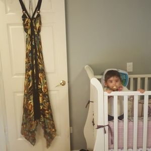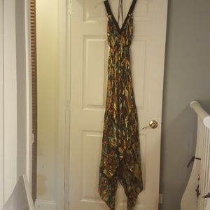 Lightweight silk, GORGEOUS low cut V neck dress with asymmetric bottom and gold threading detail and long black silk ties in back... Perfect for any event, or casual wear... Can be worn with heels or with gold or black flats... Can model if you'd like, msg me for any more info photos or measurements... The size just says P(petite) but its the type of dress that is one size fits most because of adjustable straps and flowy A line style.. The last pic is Angelina Jolie wearing this exact dress with a different pattern! hope this helps!