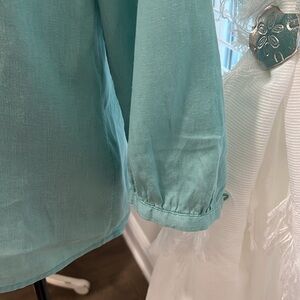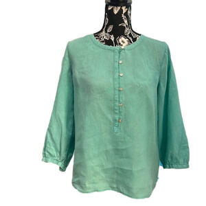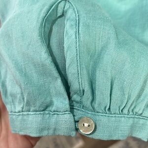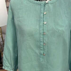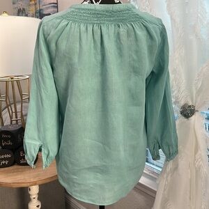 Beautiful sage green 100% linen blouse by Nicole Miller New York. Mother of pearl buttons going 3/4 down as well as on the sleeves. Smoking on the back neck, and puffed wrists. This is in great preowned condition with no tears