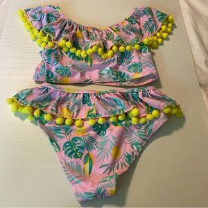 Nicole Miller 2 PC Tropical Pink Green Pom Pom Bikini Swimsuit UPF 50 Girl S 7/8