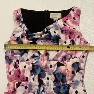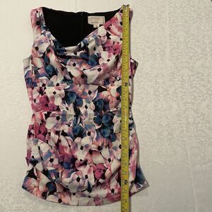 Add a touch of elegance to your wardrobe with this stunning Nicole Miller Artelier blouse. The floral watercolor linen fabric is perfect for any season and occasion, from casual outings to formal events. The sleeveless tunic style features a scoop neckline, zip closure, and a slim fit, with a collarless design and stretch for added comfort. The blouse is lined and has a pink floral color, with no vintage or personalized features. It is made in China and is perfect for women who love flower-themed clothing.