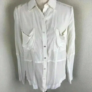 Very nice front silk button down blouse with two front pockets. Bottom of the blouse and half of elbows is sheer, sleeves can be rolled up or worn down. Raw hem.