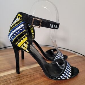 Black leather Stilletos heels with multi color seed beads decorating the heels. Ankle strap with adjustable buckles.