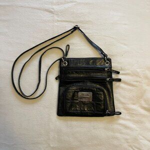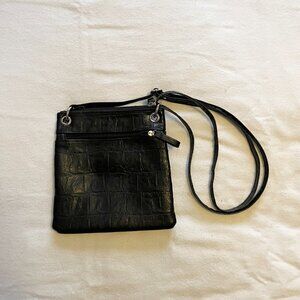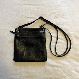 This versatile purse has many pockets for storage. There is a zippered pouch on the front of the purse along with two (2) zipper sections for additional storage. There is a zipper opening at the top of the purse. The back of the purse also has a zippered section. All the zippers have pulls that resemble the body of the purse. The strap is adjustable. The purse has an alligator pattern. It has a black satin lining.