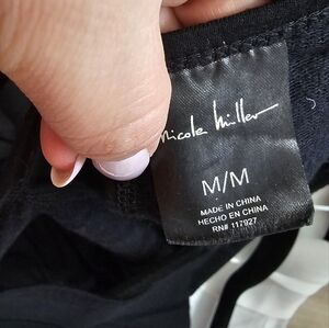 This chic black tank top by Nicole Miller features a sleeveless design with a stylish cut-out detail at the back, adding a modern twist to a classic silhouette. Perfect for layering or wearing on its own, this top combines comfort with a touch of elegance.