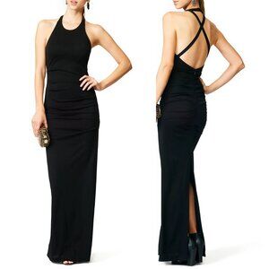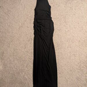 Stunning evening gown- perfect for formal events or a night out. The dress features a high neckline but the daring slit and strappy back make it more than just a black dress. The fabric is also stretchy so it's comfortable to wear. Like new condition (worn once) and runs true to size.
