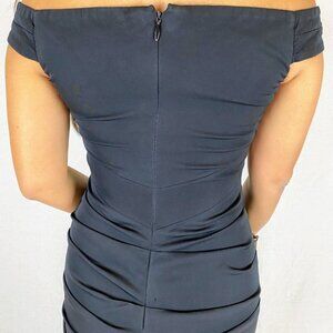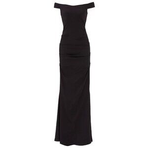 Elegance is easily achieved in this off-the-shoulder Nicole Miller gown. Super stretch fabric.