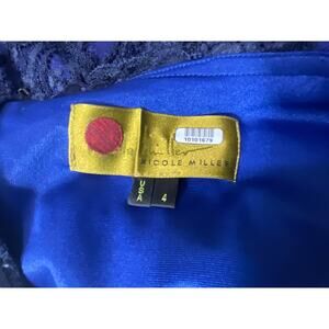 Turn heads in this Nicole Miller floor-length gown featuring a sheer blue lace overlay, open back, and fuller hemline. Two linings, back zipper, and button closure at the neck. Tagged size 4, measures 15” across chest, 13” across waist, and 60” long. Fabric has a little stretch for comfort and movement. In excellent condition.