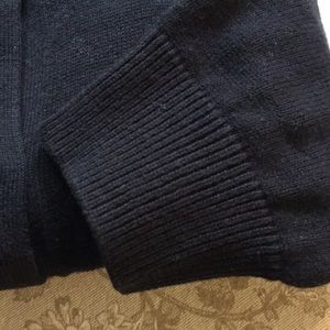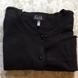 Black, long-sleeved, button-down cardigan sweater by Nicole Miller. Ribbed collar, cuffs and hem. Bright, black buttons. Excellent condition. No pulls or pills. Size L.