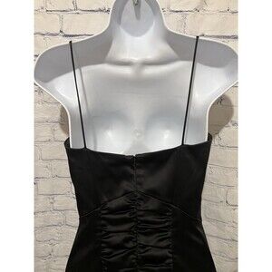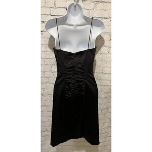 The Nicole Miller Collection Black Spaghetti Strap Ruched Cocktail Dress in size 6 is a stunning and elegant option for formal occasions like weddings or parties. The V-neckline and ruched detailing add a touch of sophistication, while the short length and bodycon style flatter the figure. Made from a luxurious satin fabric with accents of straps and zipper closures, this dress is perfect for any season and exudes a designer, chic aesthetic. Recommended for dry clean only, this dress is sure to make a statement and turn heads wherever you go. There is no size tag so please use the measurements. I am guessing it is a size 6. 15 inches pit to pit, 28 inch waist and 31 inches long. This dress is stretchy. Smoke free home.