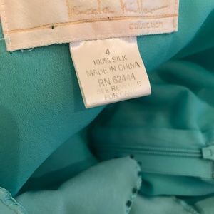 From Nicole Miller New York, this 100% silk dress features subtle sequin beading. Fully lined with a concealed side zipper for closure. Delicate ruffle neckline and sleeve. Guaranteed to turn heads! Worn only once.