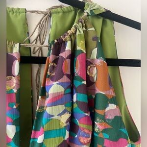 85% silk multicolor flowy dress with tie up halter neck and back zipper. No visible flaws. Please check all pics for measurements and other details. Comment/message if you have any questions.