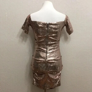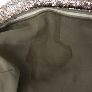 I looked closely and I don't see any missing sequins but there might be a possibility that I missed some. Lining has stains. I don't know from what. The drycleaners could probably take it out.