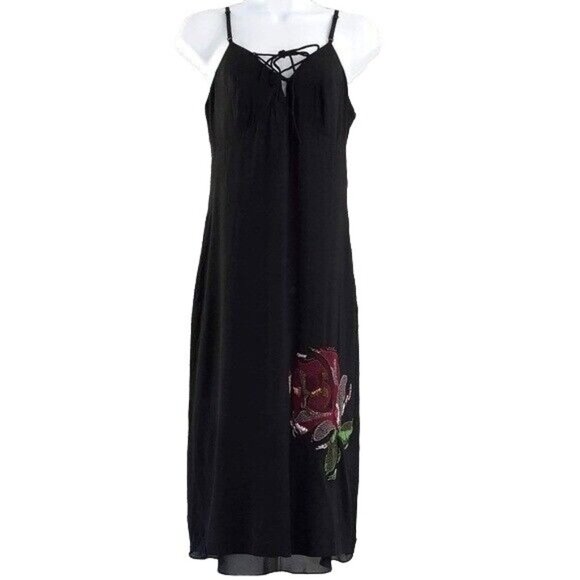 Nicole Miller Collection black silk and spandex sequin dress. Floral embroidery and beaded sequins. Adjustable spaghetti straps. Criss cross lace up tie in front. Tiered at hem. Hidden back zipper closure with hook. Excellent pre-owned condition with no stains or tears.