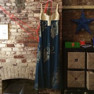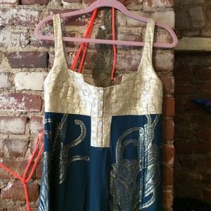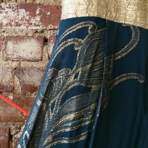 Nicole Miller Collection embroidered gown, size 4. This gorgeous embroidered silk gown is full-length, has 3/4" straps and an empire waist. The straps and bust section are gold-on-gold embroidery and the flowing, straight skirt is gold-on-emerald green. The color is subtle and beautiful, which makes the gown very elegant. It has been worn to 6 black-tie events and just came back from the dry cleaner. It is is good condition.