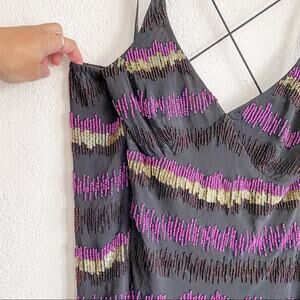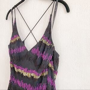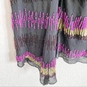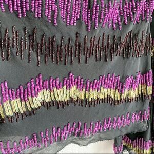 Black top with purple and brown beading with green sequins. Sheer overlay. Lined. Cross back. Cold shoulder.