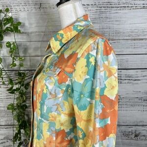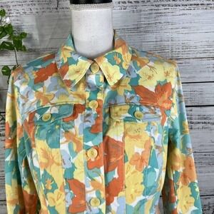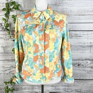 Nicole Miller Denim Jean Jacket size 12 Orange Yellow Floral Pockets Stretch