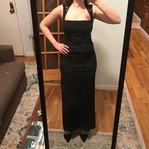 Gorgeous long black gown with sequin detailing around neckline. I picked this dress up for $97 at a rent the runway sample sale, but have yet to have the opportunity to wear it. It does have one small stain on the back (see picture) but it should come out with professional cleaning.