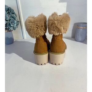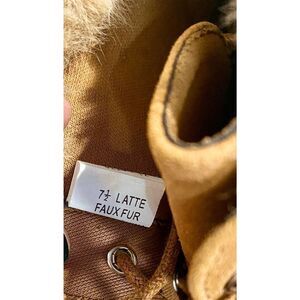 A faux fur cuff cozies up a quilted wedge bootie set on a chunky lug sole for trendy cold weather style. 8.5" shaft height 2.75" heel Round toe Lace-up vamp Grip sole Synthetic upper, textile faux fur, synthetic sole. Camel Color.