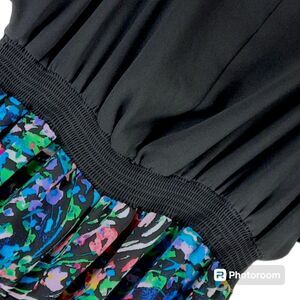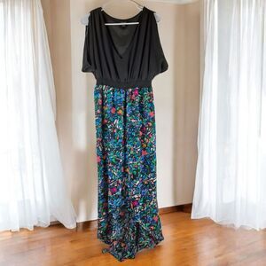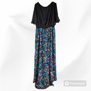 This is a gorgeous Maxi Dress by Nicole Miller that is in like new condition inside and out. This dress features a black top and a beautiful floral print skirt. This dress has wide short sleeves and a hi-low skirt. This dress is fully lined and flowy and falls all the way down to the ankles. Cover photo is AI generated so please see all original photos for exact measurements and details.