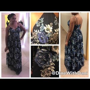 Navy blue Nicole Miller New York gown with floral appliqué overlay— with gold metallic thread detailing . 60L from shoulder to hem. V neckline, square back, thin adjustable shoulder straps. Wide waistband into pleated a-line skirt. Back zip. Polyester. Dry clean only. (Worn once for four hours.)