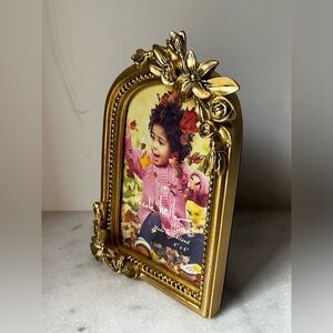 Charming gold frame with floral accents. Ideal for displaying treasured photos.