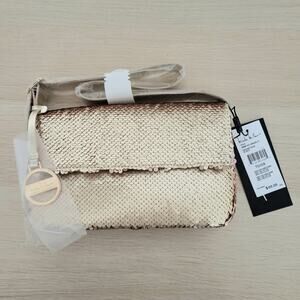 This festive bag has sequins on the front with a shiny gold back and strap.
