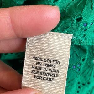 Elegant green blouse with eyelet pattern. Features a pointed collar and long sleeves.