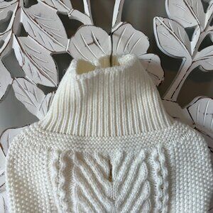 Sweater is cream with cable knit throughout, foldable turtleneck, has D-Ring slit on top, and armholes on underside.