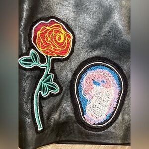 Nicole Miller, leather, mini skirt, embroidered, punk, festival, tattoo, skull rose, Y2K, streetwear, edgy, glam, concert, night out, rare find, holiday party